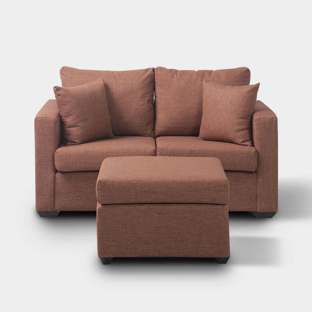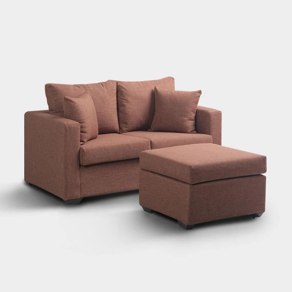 A Modern Contemporary sofa with ottoman made from fabric and gmelina solid wood. Size: 2s L140xW81.28xH81.28 cm Ottoman L50.8xW76.2xH43.18 cm
