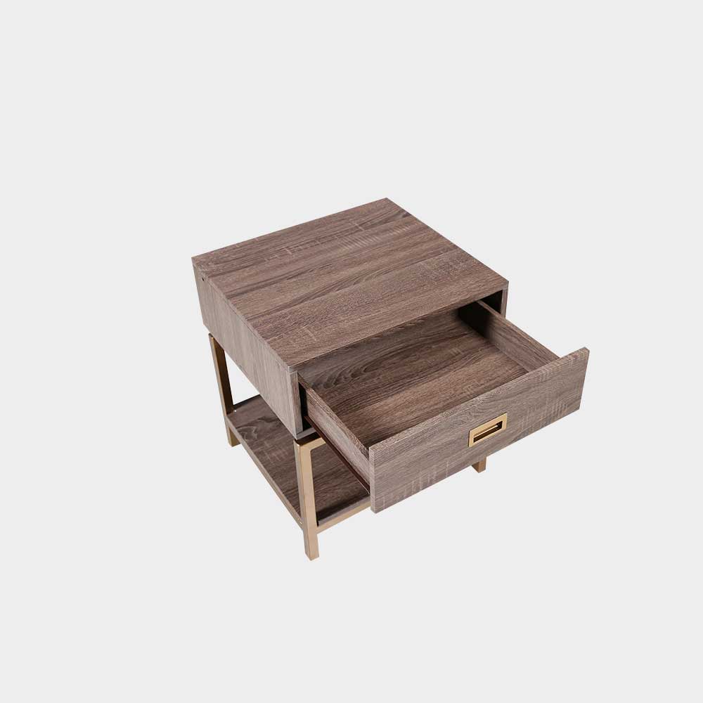A Modern Contemporary side table with drawers made from medium density fiber board, laminated with imported PVC vinyl, and has square tubular metal legs painted with antique gold powder finish. Size: L50.08xW45.72xH55.88 cm Weight capacity: 20 kg