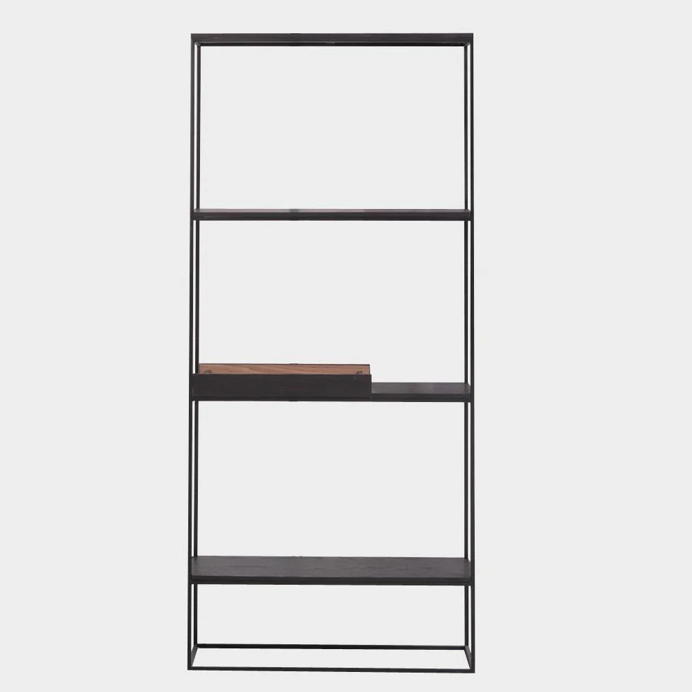 An Industrial shelving with tray made from medium density fiber board, laminated with imported PVC vinyl and legs in metal black finish. Size: L80x30x177.80 cm Weight capacity: 45 kg
