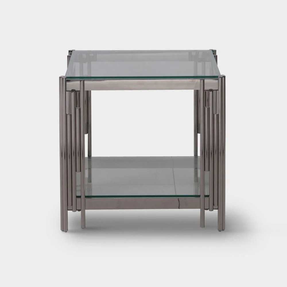 A Modern Contemporary take on an art deco inspired side table. Clear tempered glass top with metal chrome legs in silver finish. Size: L55xW55xH55 cm Weight capacity: 55 kg