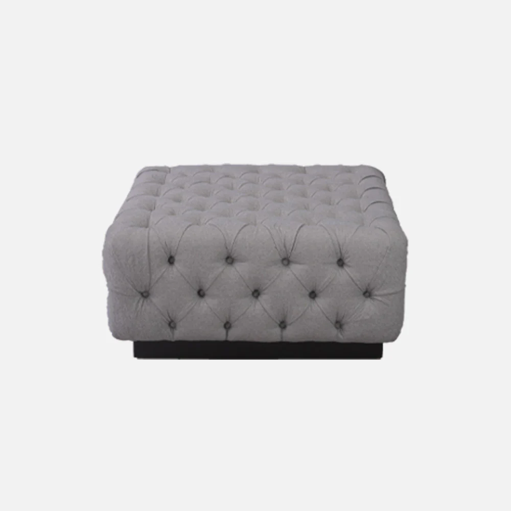 A Classic style square ottoman made with rough lumber framing and plywood padded with polyurethane foam and upholstered with a choice of fabric, velvet or leather, with diamond tufting design and block base.